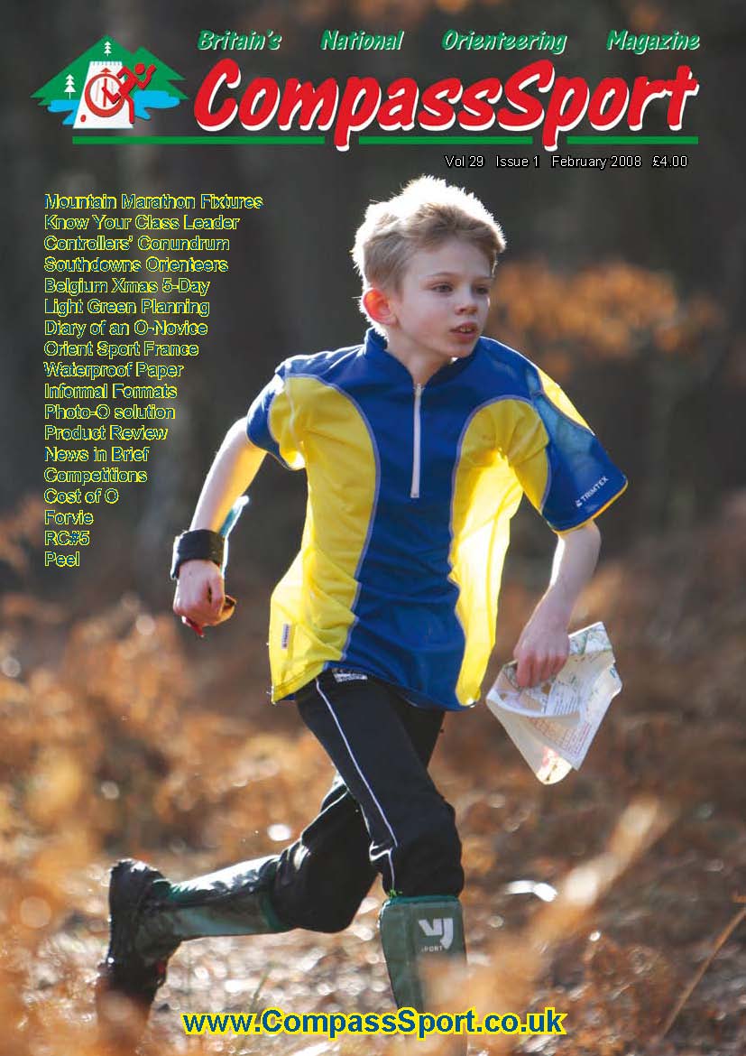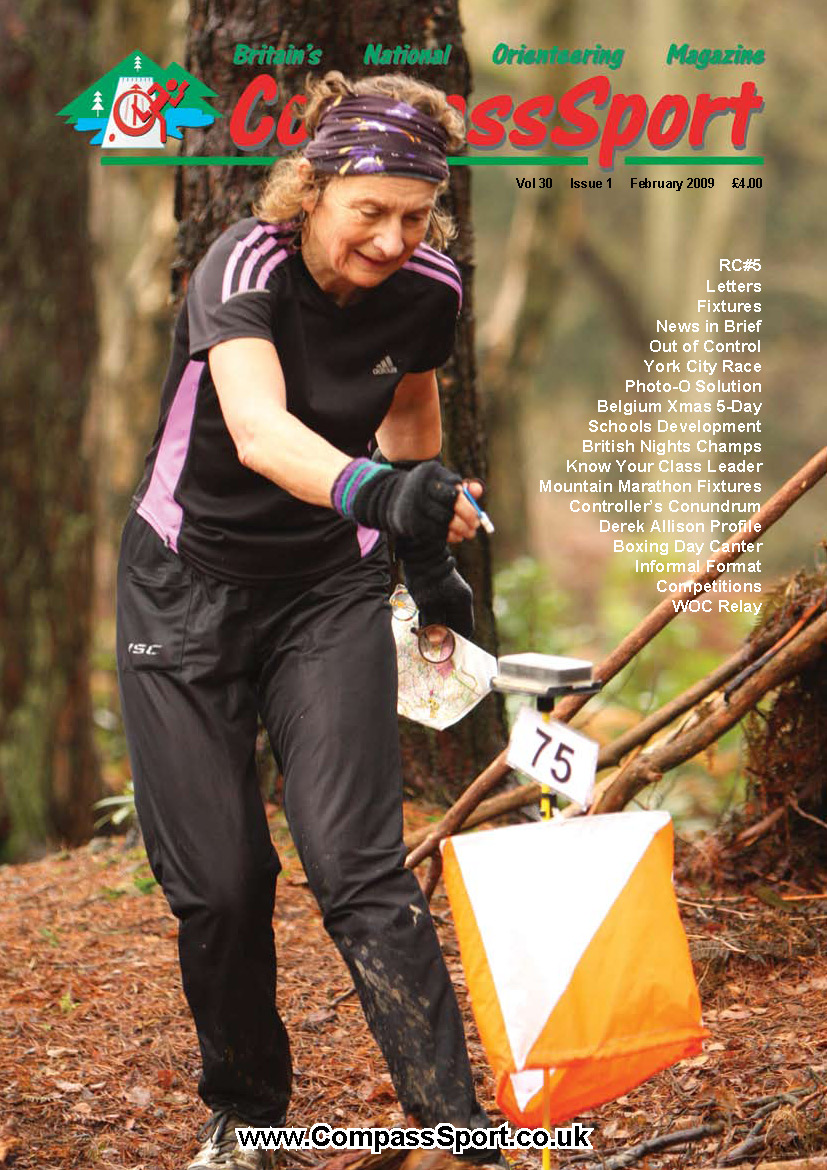 Welcome to CompassSports 30th year. The first issue of 2009 will be in the post on Wed 25th Feb.and will include Part 1 of The CompassSport History by Ned Paul, as well as British Night O Champs coverage, Wimborne OC's Boxing Day Canter, Belgium 5 days, the answers to the Photo-O and an article on how to crack Photo-O by Brian Parker. British Trail O Champs 2008, Schools Development, Know Your Class Leader is a couple of top 65's, Rumblings from the Forrest, Out of Control and Controllers Connundrums Columns, Competitions - win entries to the Swedish O-ringen and the White Rose Weekend 2009. There is also Previews of the York City Race, WMOC 09 and iROC. So, as usual, the issue is rammed full :-)